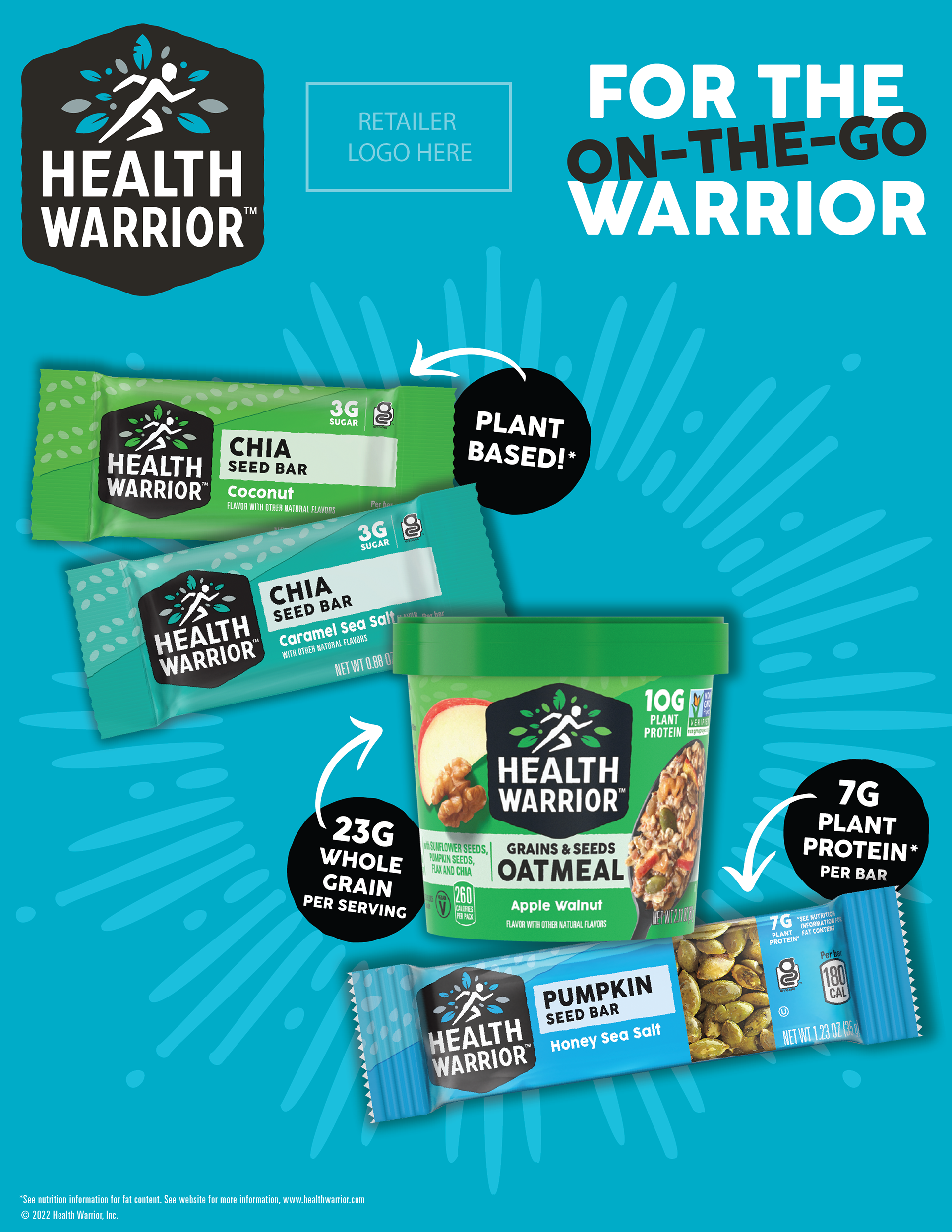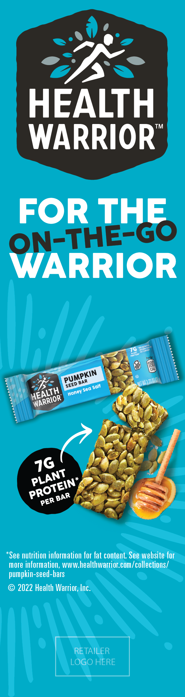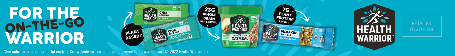 Health Warrior is a food and beverage company that makes plant based products such as protein bars, muffins, superfood protein powders and oatmeal cups. I assisted with the creation of the 2022 product ad designs for their Chia Seed Bars, Pumpkin Seed Bars and Portfolio display. The ads were versioned out into eight different dimensions to accommodate print and digital settings. Shown below are a select few examples.